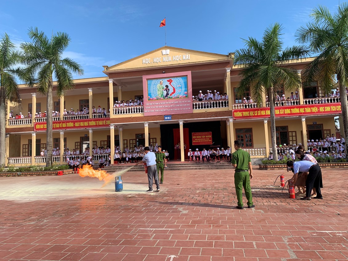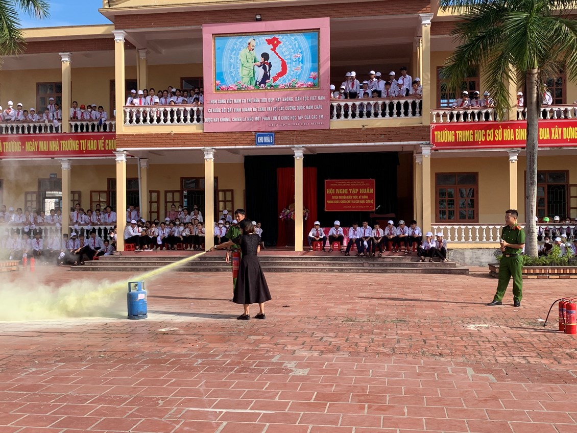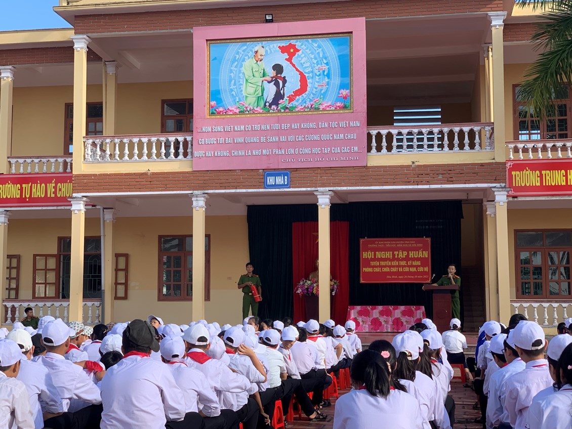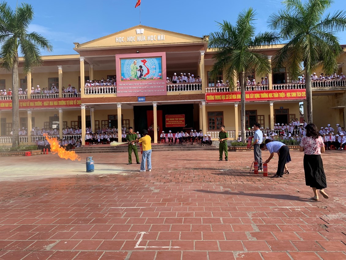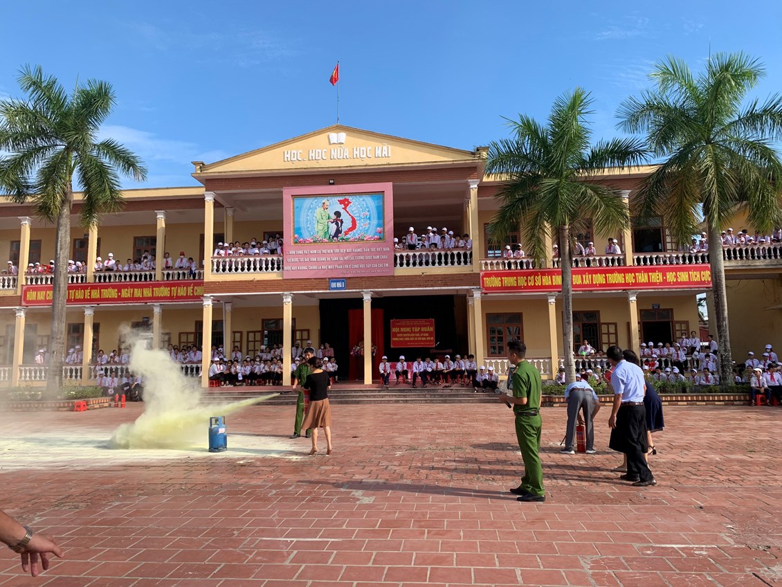 Nhằm thực hiện tốt công tác phòng cháy, chữa cháy trong trường học và nâng cao nhận thức, vai trò, trách nhiệm về công tác Phòng cháy chữa cháy cho mỗi cán bộ, giáo viên, nhân viên trong Đội phòng cháy và chữa cháy của nhà trường, sáng ngày 26/101/2023, Phòng Cảnh sát PCCC Huyện Vĩnh Bảo tổ chức tập huấn nghiệp vụ phòng cháy chữa cháy năm 2023 cho toàn thể cán bộ, giáo viên, nhân viên của 03 nhà trường THCS Hoà Bình, Tiểu học Hoà Bình, Mầm non Hoà Bình và các em học sinh trường THCS Hoà Bình.