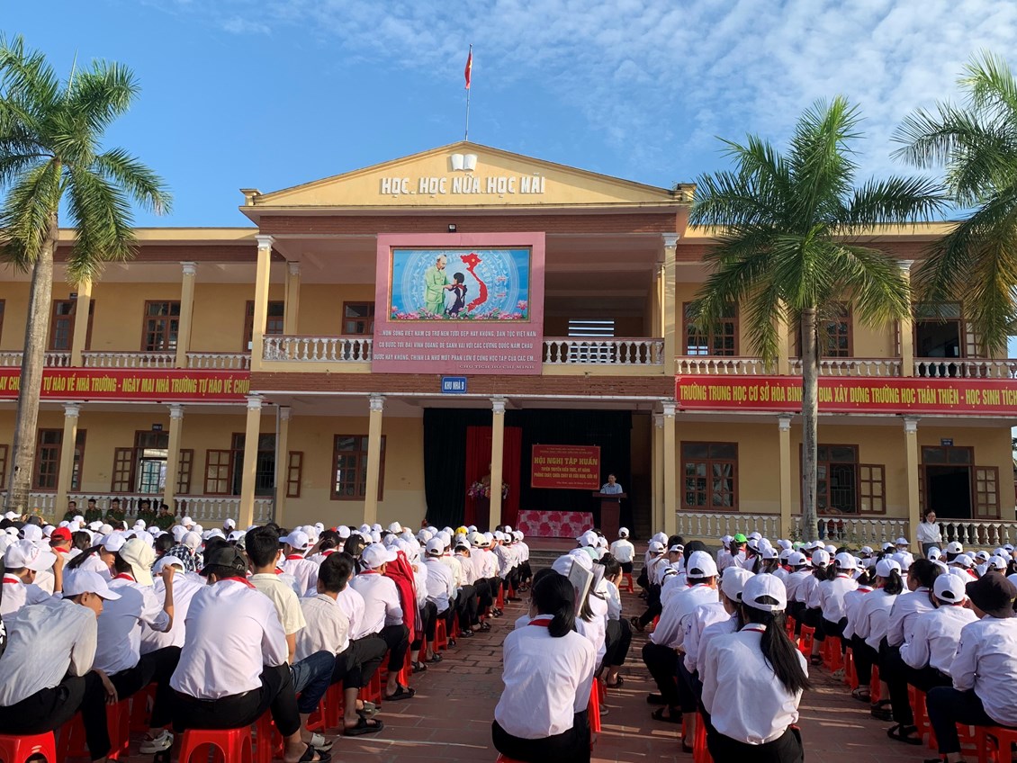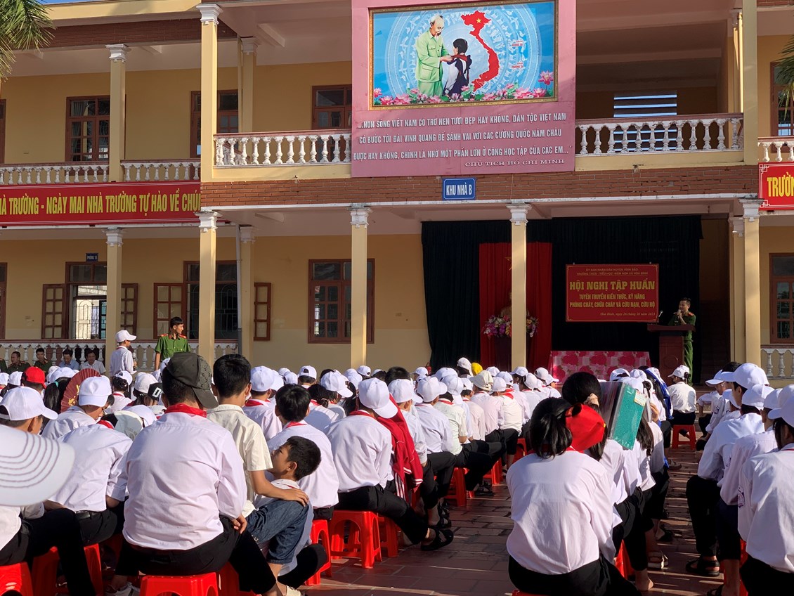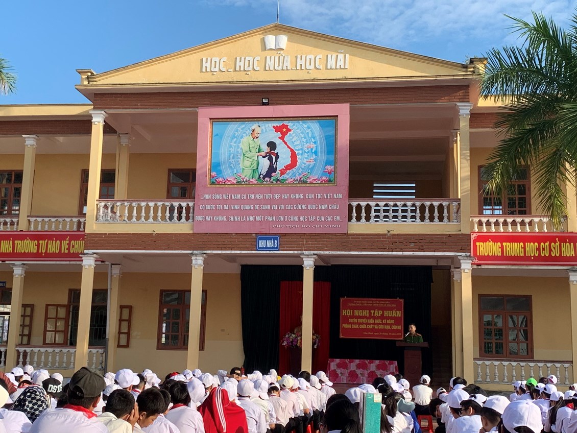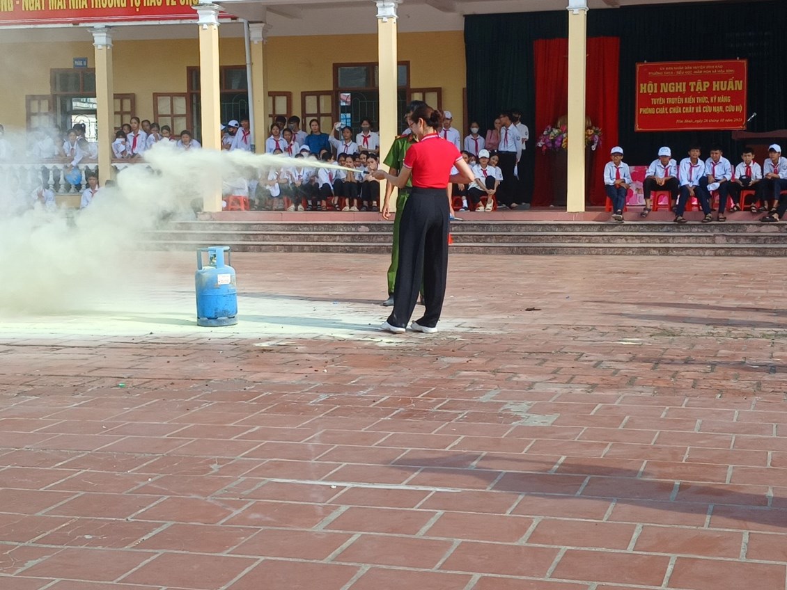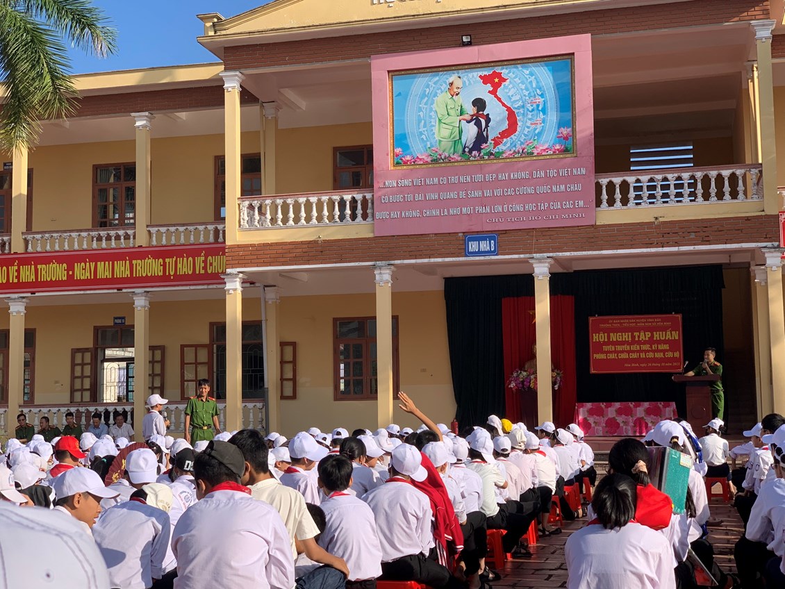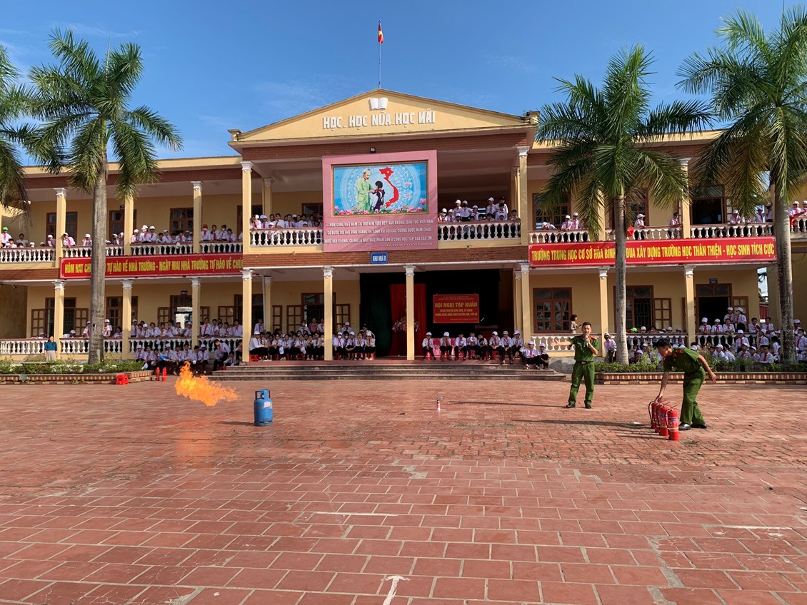 Nhằm thực hiện tốt công tác phòng cháy, chữa cháy trong trường học và nâng cao nhận thức, vai trò, trách nhiệm về công tác Phòng cháy chữa cháy cho mỗi cán bộ, giáo viên, nhân viên trong Đội phòng cháy và chữa cháy của nhà trường, sáng ngày 26/101/2023, Phòng Cảnh sát PCCC Huyện Vĩnh Bảo tổ chức tập huấn nghiệp vụ phòng cháy chữa cháy năm 2023 cho toàn thể cán bộ, giáo viên, nhân viên của 03 nhà trường THCS Hoà Bình, Tiểu học Hoà Bình, Mầm non Hoà Bình và các em học sinh trường THCS Hoà Bình.
