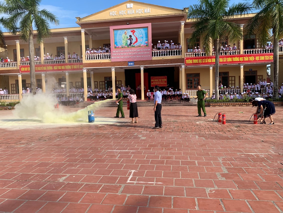 Tại buổi tập huấn cán bộ, giáo viên, nhân viên trong nhà trường được nghe Cán bộ Phòng Cảnh sát PCCC truyền đạt những kiến thức cơ bản về PCCC, các văn bản pháp luật về PCCC; các nguyên nhân gây ra cháy nổ; báo cáo về tình hình cháy, nổ xảy ra trên phạm vi toàn quốc nói chung và các vụ cháy, nổ tại trường học; tính chất nguy hiểm của đám cháy; một số nguyên nhân có thể gây cháy tại trường học và tại hộ gia đình, khu dân cư; một số biện pháp PCCC tại trường học, hộ gia đình, khu dân cư; cách sử dụng điện trong trường học và nhà ở. Cách sử dụng các phương tiện chữa cháy tại chỗ và thực hành dập lửa bằng bình chữa cháy xách tay và một số kỹ năng thoát nạn an toàn trong đám cháy.